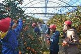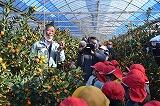 ハウスの中で、収穫の仕方を教えていただき、さっそく収穫していきました。児童は、とても大きく輝くようなオレンジ色のキンカンに驚きながらも丁寧に収穫していました。収穫したうちの一つを試食して、みんな口々に「あま~い」「おいし~い」とそのおいしさに感動していました。