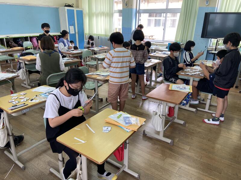 今日は、高学年の外国語の学習がありました。新しいテキストの中にあるカードを切り取り、同じ仲間でまとめていく準備の時間でした。たくさんのカードに切り取るだけでも大変だったようです。