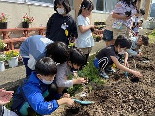 3年生が理科の時間に花の種をまきました。マリーゴールド、ひまわりなど自分の好きな花を土をいれたポットに大切そうにまきました。早くきれいな花になってほしいですね。