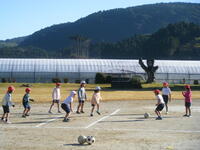 寒さが残る2時間目、2年生は運動場で元気に体育の学習をしていました。蹴ることを主運動としたボールゲームでした。味方にパスしたり、思い切って蹴ったりと楽しそうに体を動かしていました。