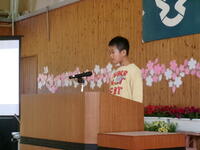 まずは、各学年の代表児童が修了証書を受け取りました。その後、児童代表で1年生のとしきさんが作文を読みました。がんばったことや、できるようになったことを堂々とした態度で発表しました。原稿を読まずに、みんなを見ながら発表していて、とてもかっこよかったです!