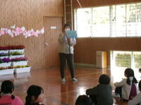 集会の後半は、学習指導部の餅原先生のお話がありました。本の読み聞かせをしてくださいました。楽しい絵本なので、子どもたちは興味津々!子どもたちにたくさん本を読んでもらいたいと思います♪