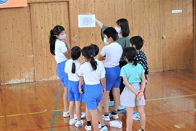 体育館で、金谷っ子たちが、何やらグループで話し合っています。