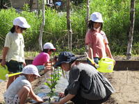 畑は、学校内にあります。用務員の森先生に協力していただいて畑を作ってもらいました。そこにみんなで野菜の苗を植えました。
