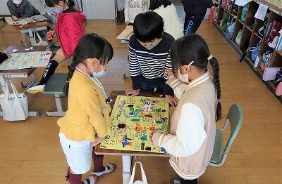 1年生と2年生が、楽しそうに「すごろく」で交流していました。