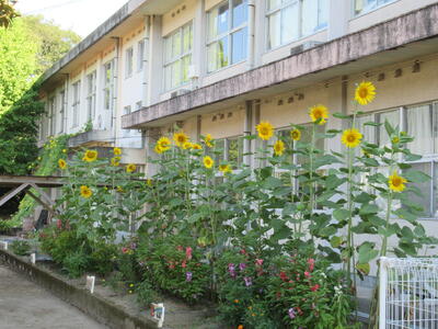 金谷小学校のひまわりさんは、暑さに負けずグングン伸びています。