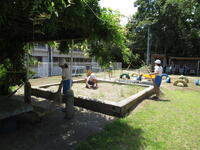 今日のそうじは、全校のみんなで中庭や玄関横の池周りをきれいにしました。