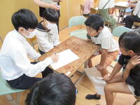 シャボン玉作りの学習では、道具作り、シャボン玉液作り、きれいなシャボン玉をつくるコツ等々、やることいっぱい!工夫もいっぱい!のお勉強です。子ども達は、先生の話をよく聞き、友達と話し合いながら学習を進めていました。