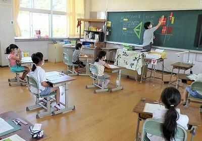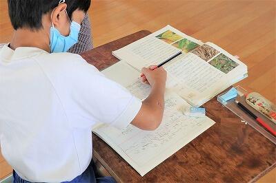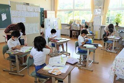 先生が4年生の指導をしている間、3年生が自分たちで学習を進めます。