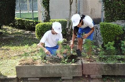 校長先生が、種から育てたキンセンカの移植を行いました。