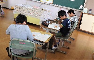 3年生が、真剣なまなざしで、何かを読んでいます。