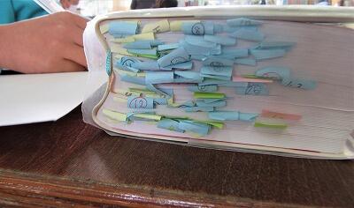 学校に戻って、インタビューメモと買い物した商品の確認中です。