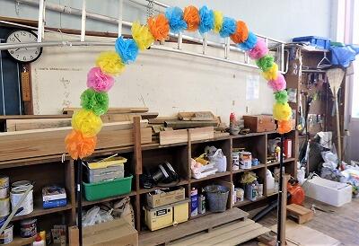 運動場には、用務員さんが作成した「アーチ」が出されています。