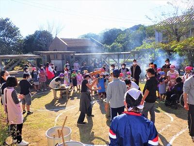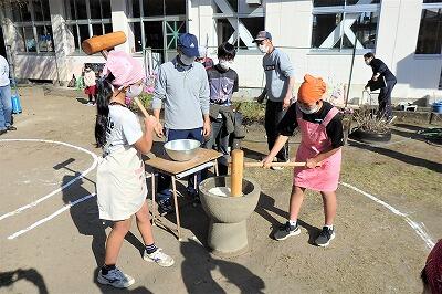 6年生は、校長先生が見守る中、リズムよく餅をつきました。