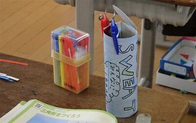ちなみに、机の上の筒は、手作りの筆立てでした。