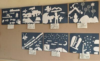 2年生は、切り取った画用紙をもとに、想像した世界を表しました。