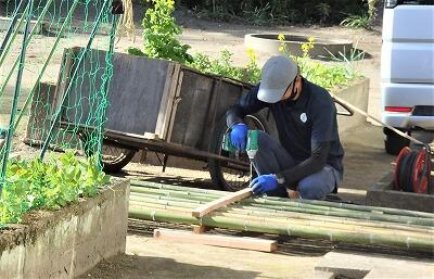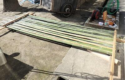 長さが不ぞろいな竹を同じ長さに切りそろえているようです…。