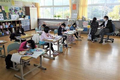 3・4年教室です。何やら、作業中のようです…。何しているのかな?!