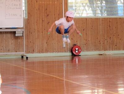 跳び箱の上で、前回りを行う「台上前転」に取り組んでいます。