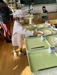 1・2年生は、1年生教室で2年生が中心になって給食を準備します。