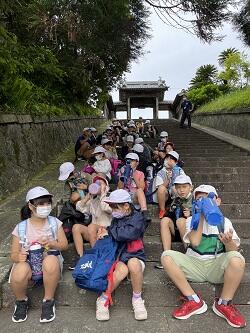 お寺の階段で休憩です・・・がんばれあと半分!!
