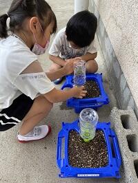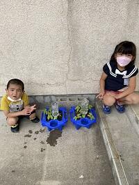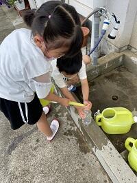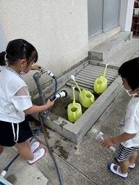 1年生が朝顔を育て始めました。そして、今日は初めて朝顔に水をやります。