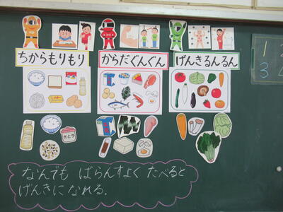 まず初めに、普段いただいている給食を振り返りました。授業のめあては『たべもののパワーをしろう』を確認!次に、先週の木曜日の給食メニューを見て、どんな食材が入っていたか振り返りました。そして、その食材を3グループ【ちからもりもり】【からだぐんぐん】【げんきるんるん】に分けていきました。食材には、それぞれ役割があることを学びました。