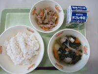 給食のメニューは、けんちん汁、豚肉の梅しょうが焼き、麦ごはん、牛乳でした。栄養満点でとってもおいしい給食でした。みんなで輪になって、給食をおいしくいただきました。これからもバランスよく食べてたくましい体づくりをしていきます!