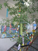 7月7日は七夕です。金谷小では毎年階段に笹竹を置いて、飾り付けをしています。今年も七夕の時期になったのでじゅんびを始めました。