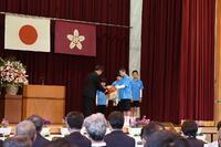表彰式では、県教育長の黒木淳一郎先生から賞状と一体となった立派な盾を受け取りました。