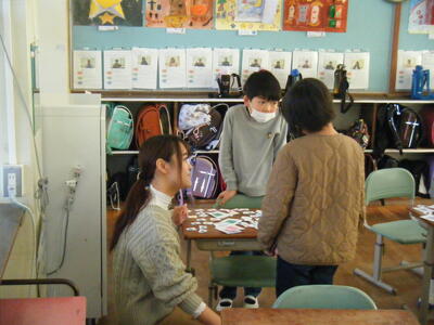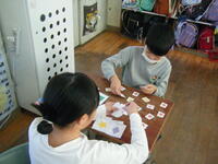 3年生は、好きな色や形を聞き合うゲーム(ビンゴゲーム)をしていました。