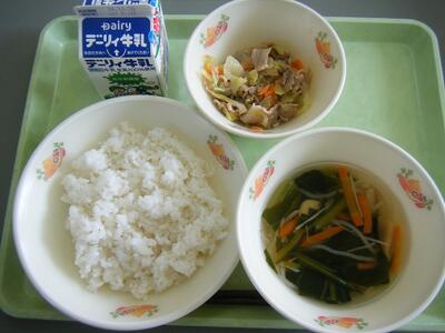 今日の給食は、麦ご飯、豆乳みそ汁、茎わかめの炒め物、牛乳でした。