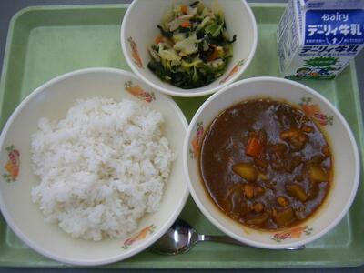 今日の給食は、麦ご飯、チキンカレー、温野菜、牛乳でした。