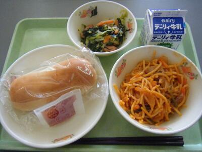 今日の給食は、減量コッペパン、和風スパゲティ、ささみチーズフライ、牛乳でした。