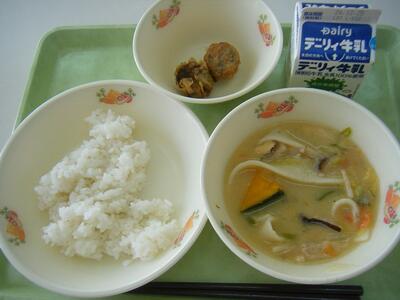 今日の給食は、麦ご飯、豚汁、とび天、牛乳でした。