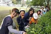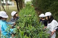 秋山小では、毎年運動場周りに植えてあるお茶の葉の茶摘みを行っています。児童の保護者も経験したことのある、昔からある行事です。