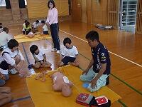 今日は、串間市消防署の救命士を講師にお招きし、児童・保護者・職員で心肺蘇生法講習を受けました。