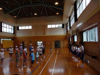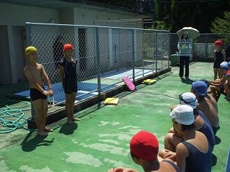 1年生は、碁石拾いや伏し浮き、けのびの発表をしました。短い間に水と友だちになっていました。
