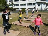 先日、個人技を高めるために、「なわとび練習板」を準備しました。大きな合板の下に角材を付け、合板がたわむようにして、その反発で跳ぶ力を補助します。この練習板を準備したところ、子どもたちは何度も何度も練習していました。少し練習しただけで、連続跳びの回数が伸びた子、二重跳びができるようになった子もいました。
