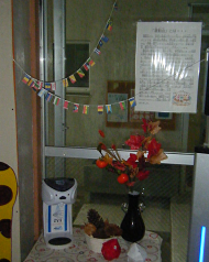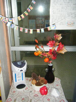 万国旗、赤白帽や秋らしいもの(栗、柿、紅葉など)を飾りました。
