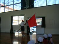 それぞれの団に団旗が手渡され、それぞれの団に分かれて、リーダーの紹介をしたり、応援の練習をしたりしました。