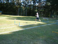 そのあと、振り上げ足、抜き足、それを組み合せた動きを練習し、1台だけハードルを跳び越す練習をしました。