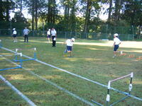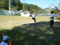 3・4年生の団技は3人または4人で長い棒でもってコーンを回り、的当てをしてリレーしていくという団技です。