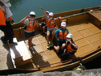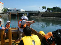 はじめに保存会の方の話を聞いた後、全員で船に乗り込み、一人一人櫓で船を漕がせてもらいました。