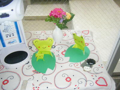 カエルは折り紙で、葉っぱは色画用紙で作りました。