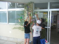 児童、職員がそれぞれ願い事を短冊に書いて飾りました。