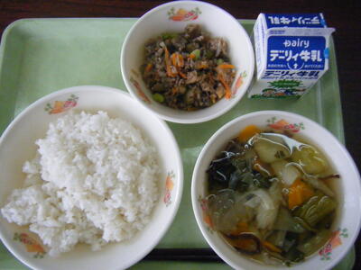 今日の給食のメニューは、豚汁、五目豆、麦ご飯、牛乳でした。