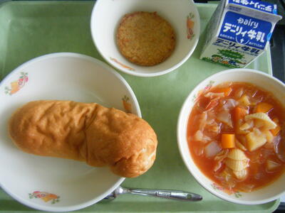 今日の給食のメニューは、ミネストローネ、カレーメンチカツ、米粉パン、牛乳でした。