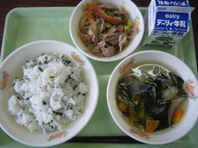 今日の給食のメニューは、つみれ団子汁、れんこんのきんぴら、わかめご飯、牛乳でした。
