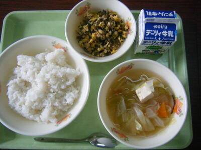 今日の給食のメニューは、五目汁、高菜そぼろ丼の具、麦ご飯、牛乳でした。